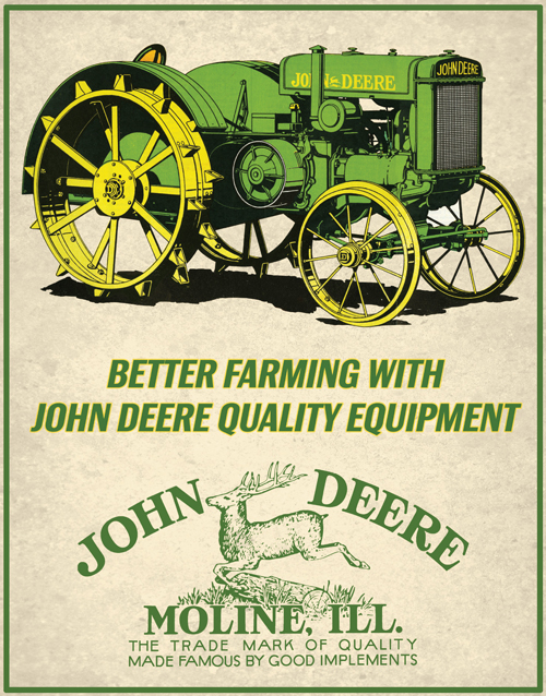 This metal sign shows a vintage John Deere tractor at the top, with the words Better Farming with "John Deere Quality Equipment" underneath. The vintage John Deere Moline logo is at the bottom of the sign. Official Licensed Product.