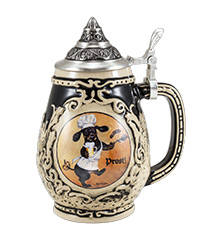 This 0.25L barrel mug is decal-decorated with a dachshund in a chef's hat and apron, cooking traditional oktoberfest fare as he holds a pint of beer. "Prost" is written beside him.