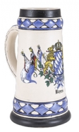 This 0.70L stein has blue diamond bands on the top and bottom that are reminiscent of the Bavarian flag. It is decorated with a Bavarian Coat of Arms motif consisting of lions, shield, crown, and flags.