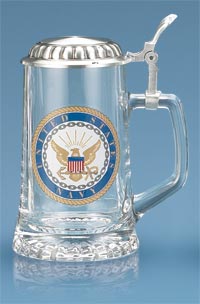 A United States Navy emblem decorates the tapered, smooth, sturdy glass body. A starburst light-reflecting pattern decorates the bottom and the smooth heavy gauge lid is removable! Perfect for personalizing on the body or the lid. The stein has a special threaded hinge pin. The lid is easily removed and reattached by simply tightening and loosening the hinge pin with an allen wrench.