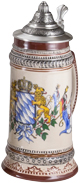 This 1.0L stoneware stein is decorated with a Bavarian Coat of Arms motif consisting of lions, shield, and crown. It is topped with a pewter lid.