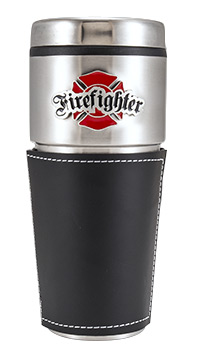 This stainless steel, 16oz, double-wall tumbler features a firefighter badge.