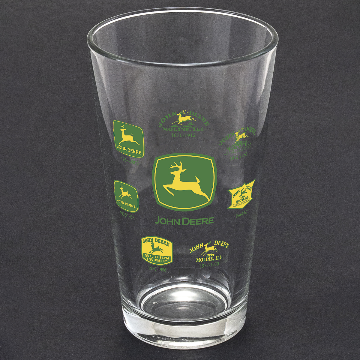 Classic shaped 16 ounce glass tumber with an historic John Deere logos design direct printed onto the glass. Official Licensed Product.