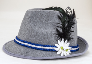 This stylish felt hat is decorated with blue and white cording, a fabric edelweiss flower and feathers. Made in Germany. One size fits most.