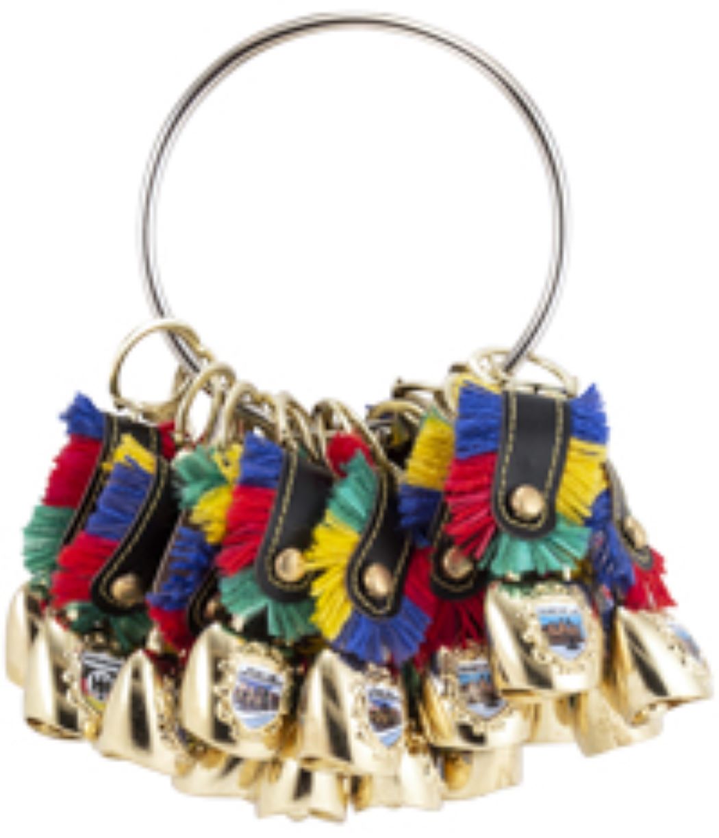Set of 12 individual bells each decorated with multicolored fringe and an embossed shield border around a German crest sticker. A gold key ring matches the bell and provides the perfect spot to hang the bell or attach it to a bag or set of keys.