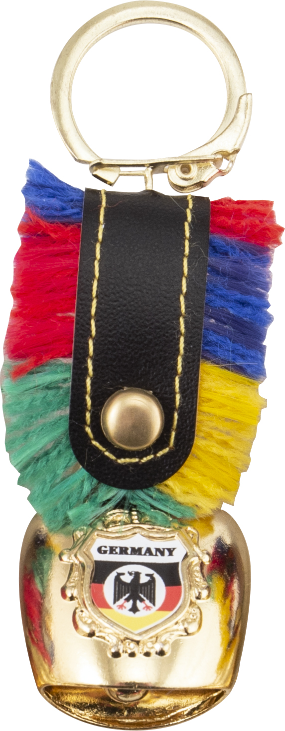 Set of 24 individual bells each decorated with multicolored fringe and an embossed shield border around a German crest sticker. A gold key ring matches the bell and provides the perfect spot to hang the bell or attach it to a bag or set of keys.