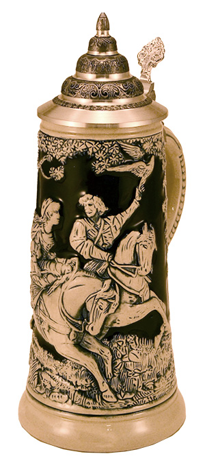 This raised-relief stein depicts a man and woman on horseback. The man is about to release a falcon into the air. A dog races alongside them.