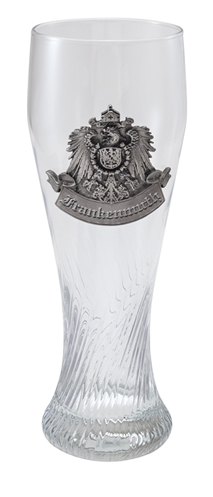 his half liter, riegsee-style pilsner has an optical spiral glass body. The front of the pilsner glass features an embossed pewter applique; that depicts a classical Roman building with columns, country shape, and the word "Frankenmuth".
