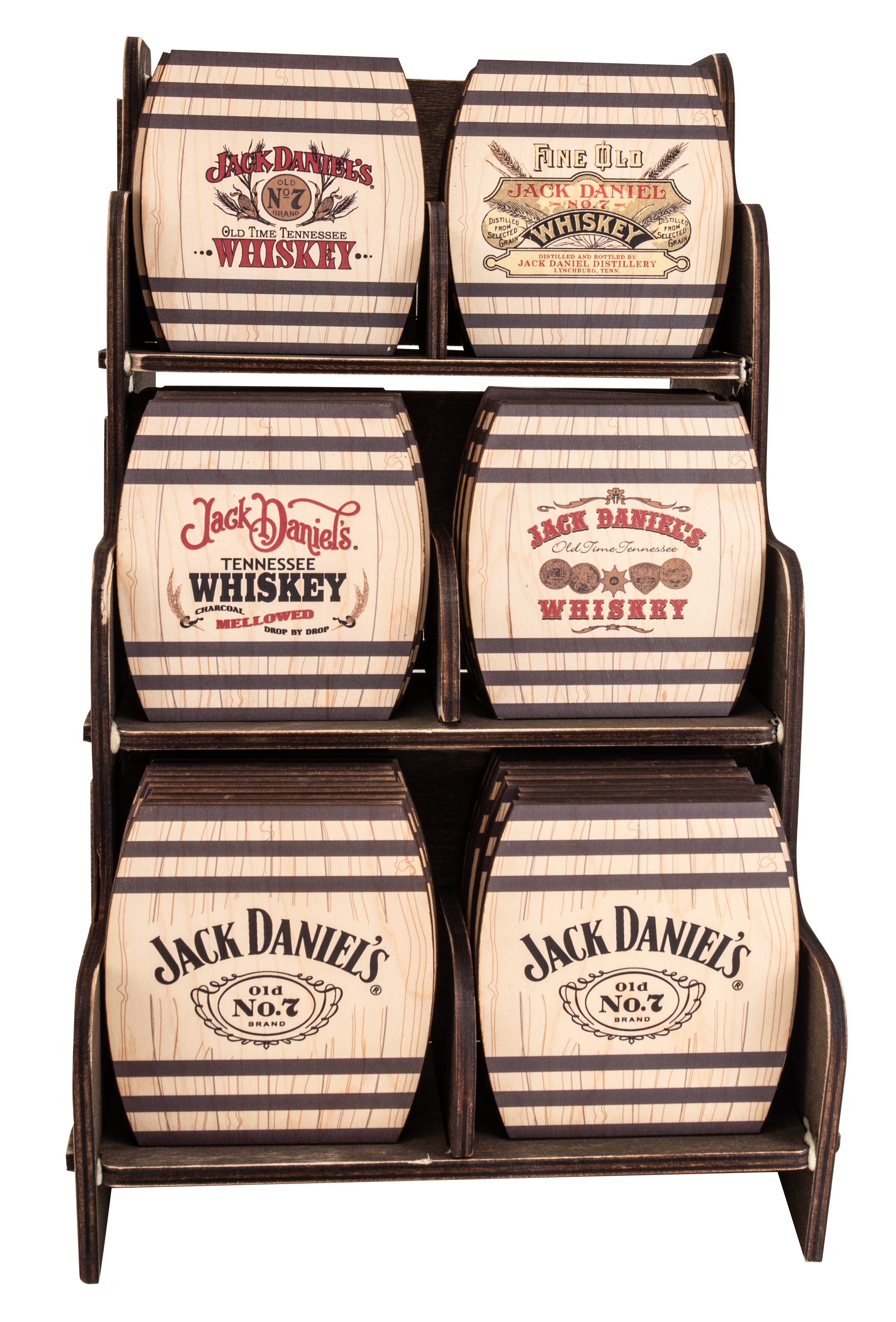Jack Daniel's 144 piece wooden coaster assortment with display rack.