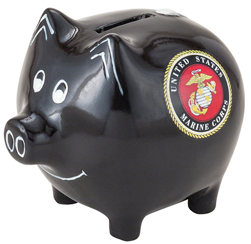 Black stoneware piggy bank with circular United States Marine Corps decal logo.
