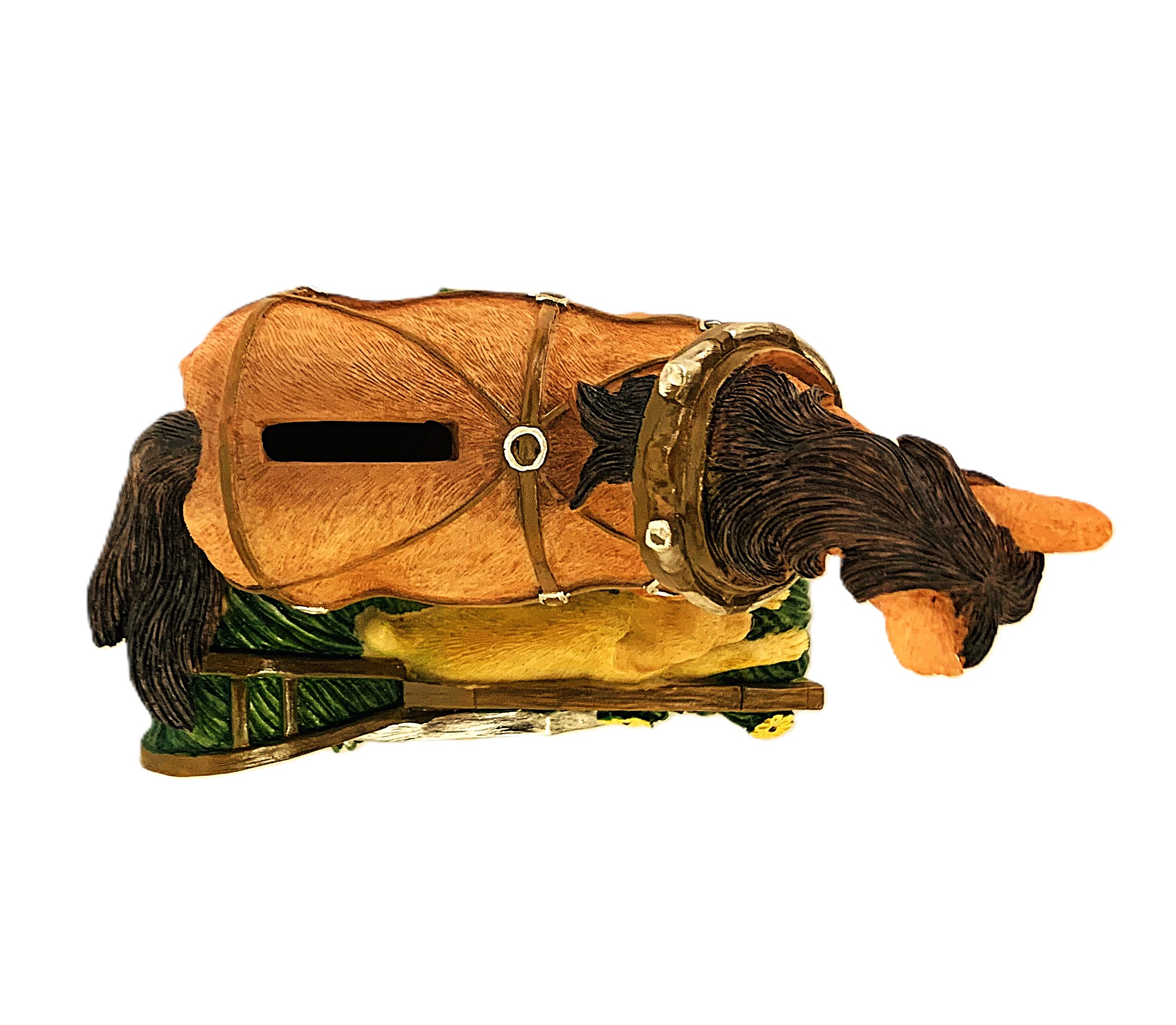 A playful pup runs along side a detailed plow horse on this beautifully crafted savings bank. Both sides of the bank display the 1912 John Deere logo. The coin slot is on the back of the plow horse and a secure twist to lock plug allows access through the bottom of the piece. Officially licensed product.