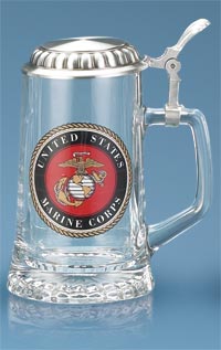 A United States Marine Corps emblem decorates the tapered, smooth, sturdy glass body. A starburst light-reflecting pattern decorates the bottom and the smooth heavy gauge lid is removable! Perfect for personalizing on the body or the lid. The stein has a special threaded hinge pin. The lid is easily removed and reattached by simply tightening and loosening the hinge pin with an allen wrench.