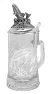 Decorated with etched-style print of a fish in water. Starburst light-reflecting pattern on the bottom. This piece is topped with a raised fish pewter lid.