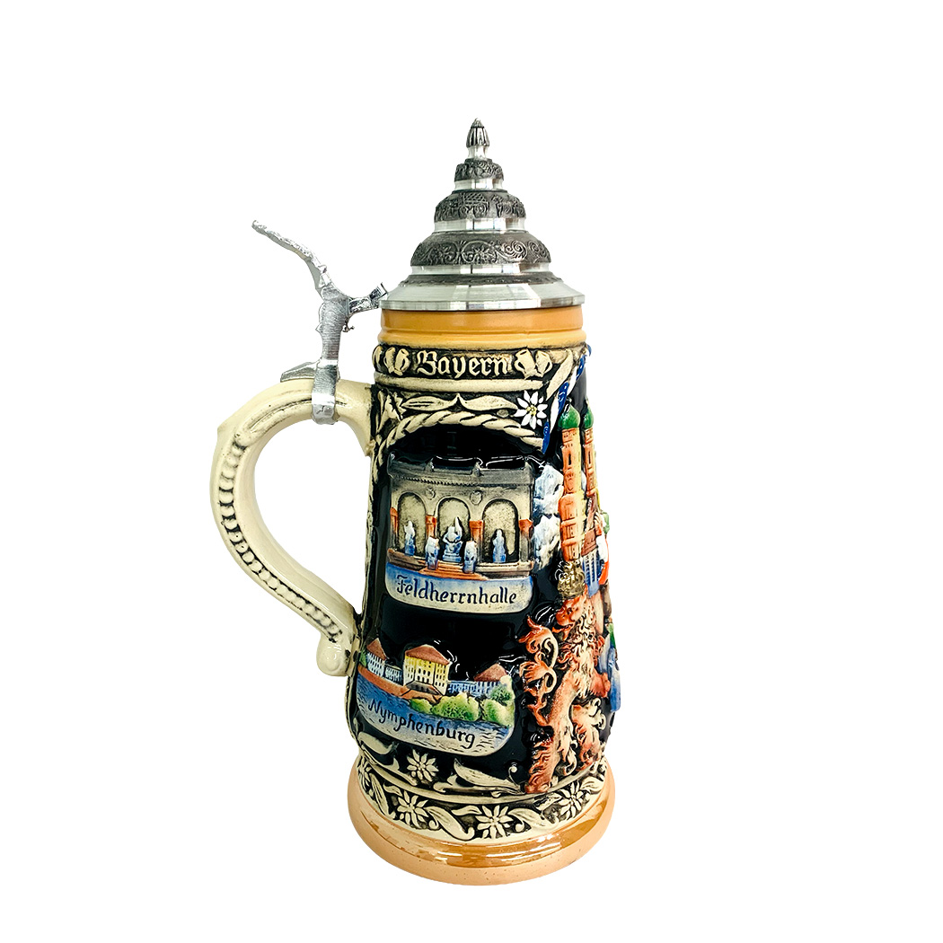 This hand-painted, raised-relief stein has a city scene on the front with two dancers frolicking over a banner that reads "Munchen". The sides of the stein are decorated with famous landmarks and events.