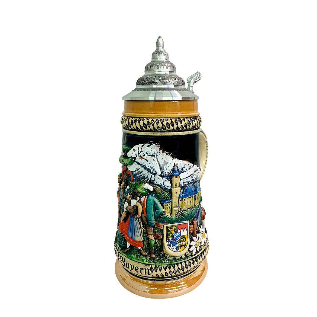 This stein depicts a couple of dancers infront of a mountain scene. It is also decorated with edelweiss flowers and a crest.