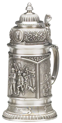This very ornate impressive one liter stein depicts three J. Wennekes sculpts. The main panel opposite the handle depicts an original by Rembrandt entitled The Night Watch. To the left is the Parrot Cage by Jan Steen, to the right is Kitchenmaid by Jan Vermeer. All three famous painters were from 17th Century Holland. Dutch sculptor Wennekes engraved this stein at a degree of detail that is unsurpassed. The ornamental domed lid features cameos of the three original artists. The base is completed with embossed name plates of these 3 artists featuring their life spans.