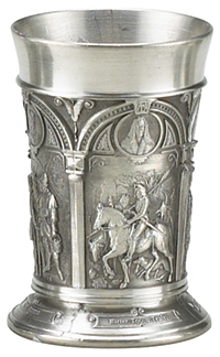 Pewter, raised-relief decoration. This is a companion piece to Item #5057 chalice and Item #5052 stein. The body design consists of four subject panels depicting works by this famous Renaissance painter and engraver. Pillars, archways, portraits, and his famous signature serve as border decorations.