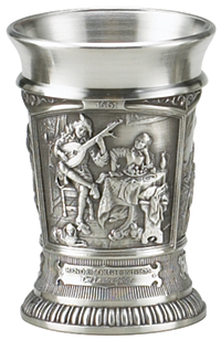 This very ornate pewter shot depicts three J. Wennekes sculpts. One panel depicts an original by Rembrandt entitled The Night Watch. To the left is the Parrot Cage by Jan Steen, to the right is Kitchenmaid by Jan Vermeer. All three famous painters were from 17th Century Holland. Dutch sculptor Wennekes engraved this piece at a degree of detail that is unsurpassed. Below each panel the base is embossed with a name plates of the corresponding artist.