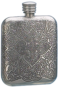 An antiqued deep stamped design creates this very uniquely decorated flask. The design appears on both the front & back sides. All four corners are rounded. Slightly curved, classic hip shape. Twist-off pewter cap. Antiqued finish. Made in England.