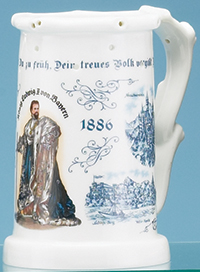 The body design features the most famous King of Bavaria surrounded by Bavarian blue images of the various castles that were credited to him. This design is applied to the traditional puzzle porcelain body in which numerous holes pass through the top half of the stein body and the along the lip rim and handle. There is only one special way in which to drink from this stein without spilling. First, hold the tankard with the left hand, then plug the hole that is underneath the handle with one finger. There is another hole inside the mug at the very base of the handle. The handle is actually hollow and functions as a straw. The liquid passes through the handle and to the first hole on the lip rim. Therefore, to perform the joke, the drinker needs to actually draw the drink through the hole rather than trying to pour the liquid all the way up to the mouth of the stein. An attractive finishing touch is a porcelain lithophane (see-through) bottom picture.