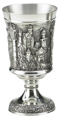 A full body detailed view of King Ludwig of Bavaria and the years of his reign appear along with detailed pictures of Linderhof, Neuschwanstein and Herrenchiemsee, castles of which he is credited with building wraps around the body of this lovely pewter chalice.