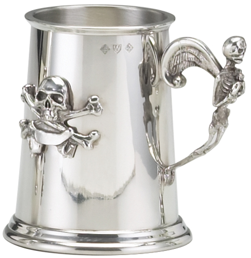 Brightly polished finish. A separately cast skull and crossbones is applied to the body of the tankard. The handle is a separately cast winged skeleton. Glass bottom. Made in England.