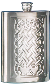 Brightly polished pewter flask stamped with an interweaving knotwork serpent pattern. It has a slightly curved, classic hip shape and a twist off pewter cap. Made in England.