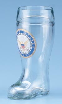 This popular, glassware drinking vessel features an Navy emblem decoration. Beer boots are an excellent topic of conversation. The secret to drinking from the boot is to point the toe sideways. When the toe is pointed downward, the boot cannot be easily emptied. When the toe is pointed upwards, the liquid flows out of the boot very quickly and uncontrollably, usually spilling all over the drinker. Machine made.