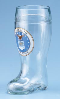 This popular, glassware drinking vessel features an Air Force emblem decoration. Beer boots are an excellent topic of conversation. The secret to drinking from the boot is to point the toe sideways. When the toe is pointed downward, the boot cannot be easily emptied. When the toe is pointed upwards, the liquid flows out of the boot very quickly and uncontrollably, usually spilling all over the drinker. Machine made.