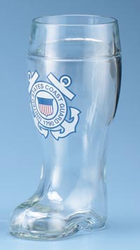 This popular, glassware drinking vessel features an Coast Guard emblem decoration. Beer boots are an excellent topic of conversation. The secret to drinking from the boot is to point the toe sideways. When the toe is pointed downward, the boot cannot be easily emptied. When the toe is pointed upwards, the liquid flows out of the boot very quickly and uncontrollably, usually spilling all over the drinker. Machine made.