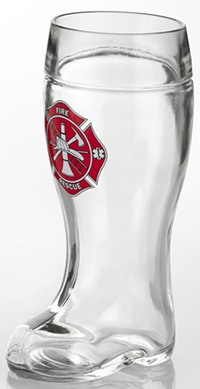 This popular, glassware drinking vessel features a fireman Maltese Cross emblem decoration. Beer boots are an excellent topic of conversation. The secret to drinking from the boot is to point the toe sideways. When the toe is pointed downward, the boot cannot be easily emptied. When the toe is pointed upwards, the liquid flows out of the boot very quickly and uncontrollably, usually spilling all over the drinker. Machine made.