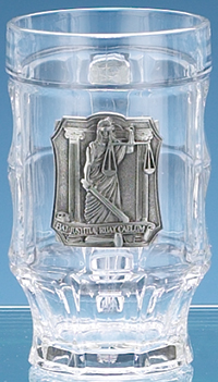 A pewter medallion with the Scales of Justice amidst pillars and a gavel decorates the front of this sturdy, multifaceted glass mug.