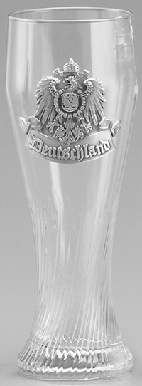 The tall slender shape of these glasses is recognized throughout the world, often also referred to as weizenbier glasses as they are used to serve highly carbonated wheat beers. This pilsner glass features an optic spiraled base with generous capacity. The embossed pewter applique depicts an Imperial German eagle with crown above a Deutschland banner.