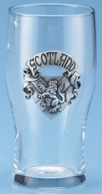 Standard 1 pint pub glass is decorated with a pewter applique with the word SCOTLAND incised on the banner above a shield blazoned with the St. Andrew Cross and the rampant lion of Scotland.