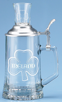 This glass stein features a white shamrock design with the word Ireland in the middle on both the stein body and the shot glass. The pewter lid of the stein includes a pewter cup for the shot glass to rest in.