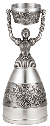 Pewter, brushed finish. One of the most charming of all legends. The swiveling cup and hollow dress were originally designed to allow both bride and groom to drink simultaneously and toast their wedding. Delicate relief work is present throughout the item focusing on a floral plant pattern around the skirt and bucket. An ideal wedding gift. Open areas on the skirt are suitable for engraving or personalization.
