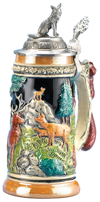 This stoneware, raised-relief, hand-painted stein depicts a forest wildlife scene. Various forest creatures roam near a cottage in the background and a squirrel climbs up the molded handle. A pewter figurine of a sitting fox is fixed to the lid completing this traditional style stein.