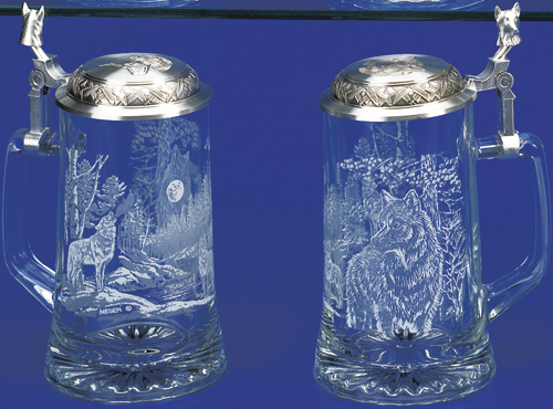 This scene was drawn by James A. Meger and depicts a close-up view of an alpha wolf on the right side and a howling wolf with moon in background on the left side of the stein. Etched style high fired print. The embossed pewter lid is adorned with a wolf motif and a pewter wolf head thumblift completes the stein.