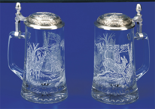 The motif on this stein was created by James A. Meger and features a white tail deer buck watching a doe leaping over a fallen tree. Etched style wrap-around high fired print is permanently fused onto the glass. The pewter lid features an embossed portrait of a buck. Pewter deer head thumblift.