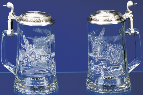 This scene was also painted by James A. Meger and features two pair of mallards. A drake and hen are ascending on the left side of the stein, while another pair swim patiently on the right side. The pewter embossed lid features one duck in flight. Pewter duck head thumblift.