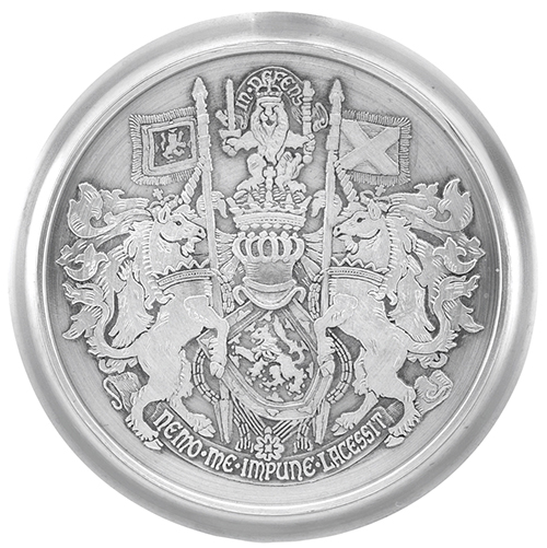 This stein pays tribute to Scotland. It is decorated with a wrap-around blue knotwork motif that frames two thistles. The main subject is a pewter medallion with the word Scotland incised on a banner above a shield blazoned with the St. Andrew Cross and the rampant lion of Scotland. On the lid is a precisely detailed representation of the Royal Arms of the Kings of Scotland. The Scotland applique; was sculpted by Bob Maurus, and the lid and body motif were designed by him as well.