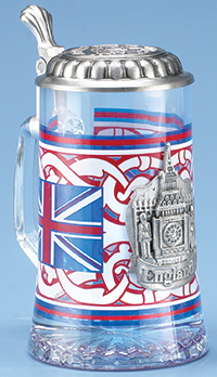 The Union Jack in red, white & blue colors is prominently displayed on both sides of this direct screen wrap-around body design. In the center is an applique inspired by Big Ben and the Queen's Guards. The word England appears on a ribbon at the bottom of the applique. On the lid is the official England Coat of Arms inscribed with the words ENGLAND.