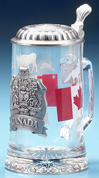 The Canadian flags in red and white colors are on both sides of the stein. Canadian wildlife are depicted above and below each flag in an etch-white design: moose, Canada geese, wolf, salmon and polar bear. In the center of the stein is an embossed pewter applique featuring the Canadian coat of arms above a CANADA banner. The embossed pewter lid features a maple leaf and the word CANADA.