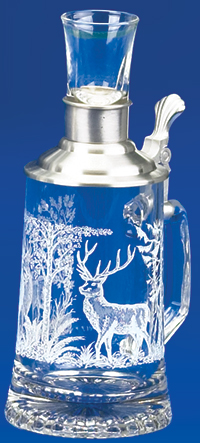 Pewter lid holds a shot glass. Stein decorated with etched-style deer print. Starburst light-reflecting pattern on bottom.