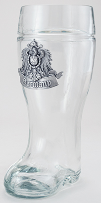 This popular, glassware drinking vessel features the German crest pewter badge. Beer boots are an excellent topic of conversation. The secret to drinking from the boot is to point the toe sideways. When the toe is pointed downward, the boot cannot be easily emptied. When the toe is pointed upwards, the liquid flows out of the boot very quickly and uncontrollably, usually spilling all over the drinker. Machine made.