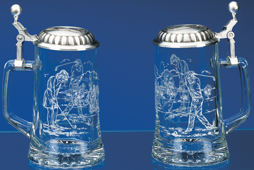 A timeless best seller! This stein features a high-fired etched-style wrap-around print of a male golfer on one side, a female golfer on the other side and a group of golfers on a fairway between them. The embossed pewter lid features a detailed golf bag. The pewter thumblift is in the shape of a golf ball.