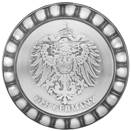 The German flag colors of black/red/gold are featured on the wrap-around transparent high-fired design decorating the body of this stein. The front pewter embossed applique; depicts an eagle with crown above a Germany banner. German flags appear on the sides behind it. The body design is completed with leaves ribbons. On the pewter lid is an embossed pattern of the Imperial Eagle the phrase OLD GERMANY.