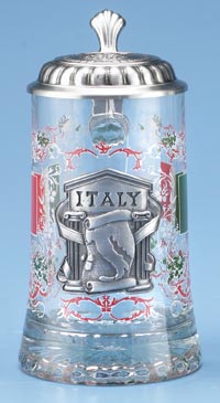 The Italian flag colors of red/white/green are high-fired in a detailed transparent pattern on the glass body of the stein, suggesting famous Roman architecture with vines and Romanesque artistry. A pewter three-dimensional applique; featuring a map of Italy and a pillared gate is in the center of the body. On the lid is an embossed Coat of Arms and the word ITALY.