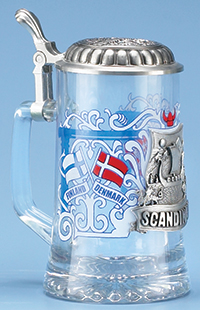The colors red/white/blue are intermixed on this high-fired body design that features the flags of Finland Denmark on the left side and the Swedish Norwegian Coats of Arms on the right side, along with a Viking helmet front and center. The center of the stein features a beautifully detailed landscape embossed in pewter in which a Viking ship at sea is in the foreground, snow-capped mountains are seen in the background with rising sun. The word SCANDINAVIA is prominently featured on this applique; as well the lid design amidst a filigree design.