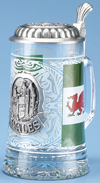 The official flag of Wales with Welsh dragon is high fired on both sides of the stein. In the center of this design is a pewter embossed applique featuring the word WALES and a detailed castle (representing the many from Wales). On the lid is a map of the country and the word WALES twice along the circumference.
